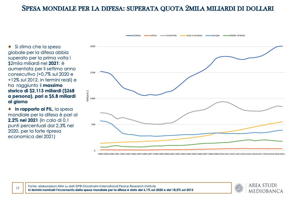 Per la prima volta la spesa globale per la difesa ha superato i 2 mila miliardi di dollari nel 2021 (+0,7% sul 2020 e +12% sul 2012, in termini reali), raggiungendo il massimo storico di 2.113 miliardi di dollari (2,2% del PIL globale), pari a 5,8 miliardi al giorno.