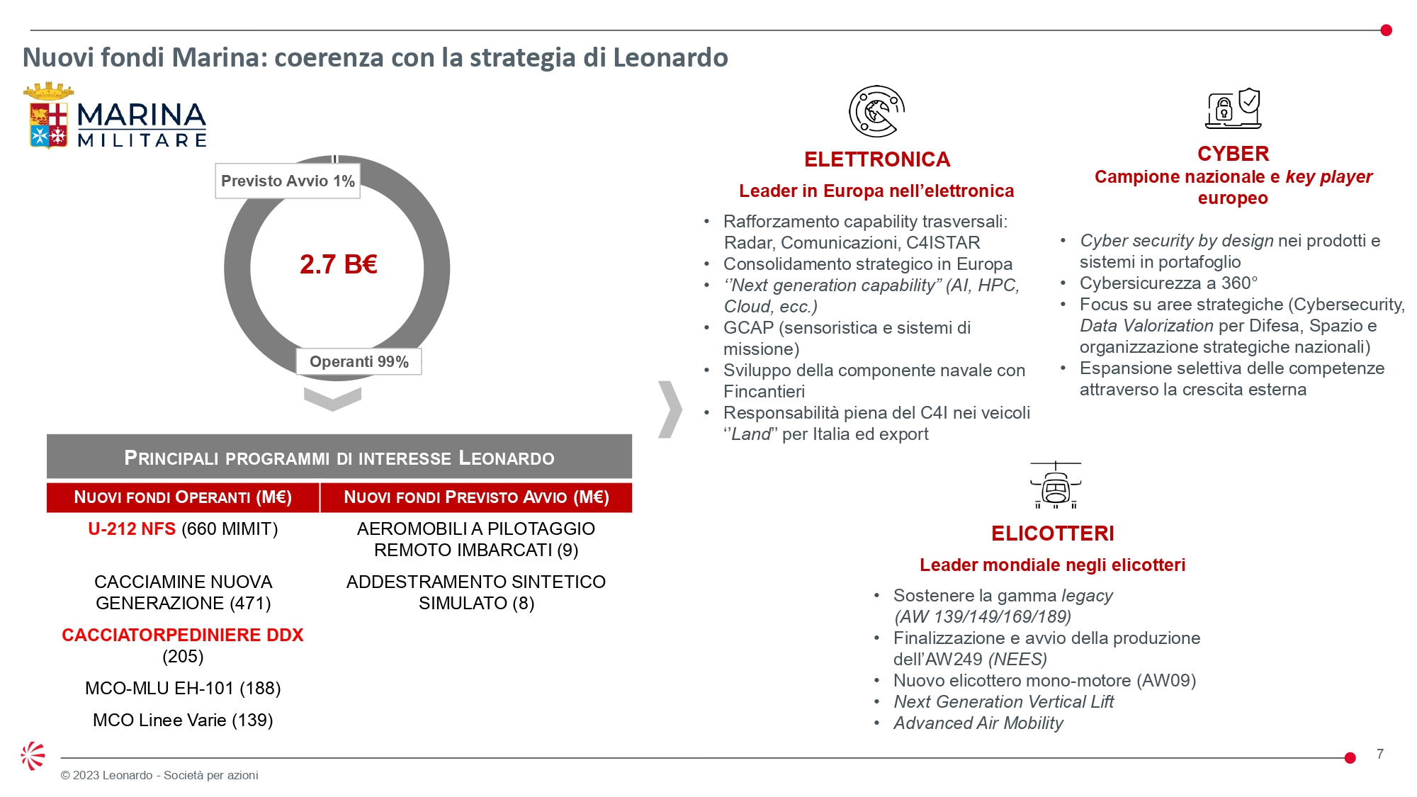 “Rispetto agli altri Dpp c’è un’altra buona notizia – ha continuato il direttore generale di Leonardo – ossia un incremento di livello della spesa sugli 8 miliardi che si mantiene, anzi, cresce e si mantiene fino a 8,7 miliardi nel triennio 2023 – 2025”. “Per noi – ha concluso Mariani – è garanzia di stabilità nella programmazione”.