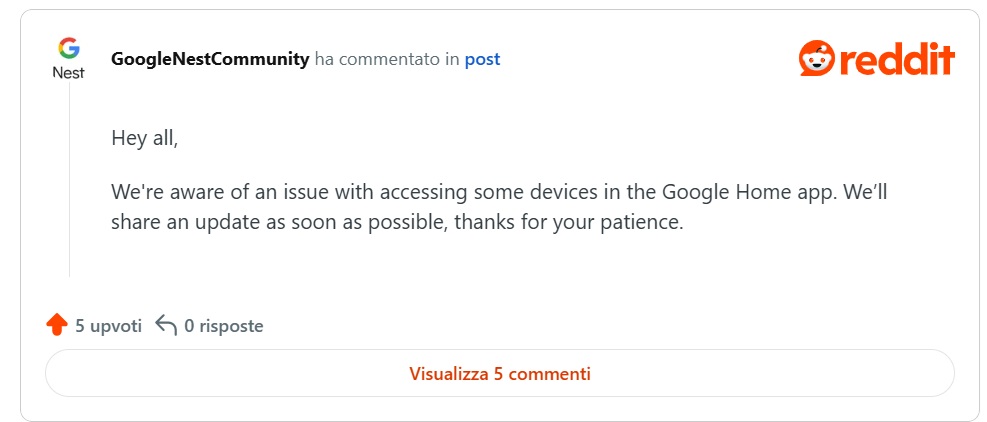Ma la casistica risulta assai più variegata: non sono pochi gli utenti che sostengono che sia aumentata la latenza nella risposta del device, altri riferiscono di crash continui e riavvii altrettanto frequenti mentre nelle ultime ore si è diffusa la notizia che i proprietari delle videocamere di sorveglianza Nest di prima generazione sostengono siano perennemente offline, disconnesse cioè dall’app Google Home. In una parola: inutilizzabili. Problemi che sarebbero incominciati con ogni probabilità con la migrazione dall’app di Nest a quella attuale, omnicomprensiva, Google Home.