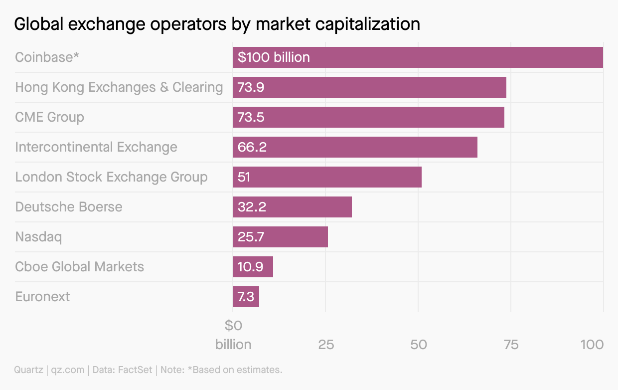 Coinbase genera più entrate per operazione rispetto alle principali borse statunitensi, anche se quei mercati gestiscono da 60 a 100 volte più scambi teorici (importo in dollari) rispetto alla piattaforma crittografica, sottolinea Quartz.