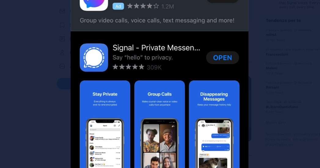 “Non ci saranno mai annunci in Signal, perché i tuoi dati appartengono alle tue mani, non alle nostre” si legge in un tweet pubblicato il 10 gennaio dalla società.