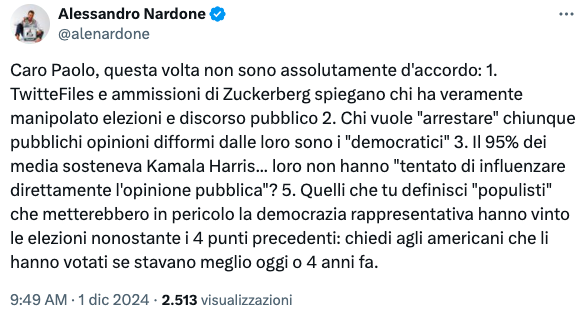 “Musk ha speso 40 miliardi per rilevare Twitter, o X, proprio per difendere questo diritto, che è il fondamento di tutti gli altri”, dichiarava Nardone, il quale, dicendo che Hillary Clinton ha affermato “che vorrebbe mettere in galera chi pubblica post contenenti disinformazione”, si chiede “chi decide cosa è disinformazione e cosa è semplicemente una libera opinione?”.