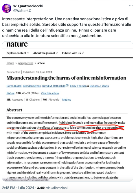 Infine, Walter Quattrociocchi, responsabile del Center of Data Science dell’Università La Sapienza, ha condiviso il suo disappunto con padre Benanti su X postando uno studio, pubblicato su Nature, in cui si afferma che “Gli intellettuali pubblici e i giornalisti fanno spesso affermazioni generiche sugli effetti dell’esposizione a contenuti falsi online che non sono coerenti con gran parte delle prove empiriche attuali”.