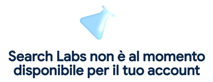 Faccio allora una ricerca su Google, approdo sulla pagina di supporto della società e leggo questo: “Per avere accesso in anteprima alle funzionalità nuove e sperimentali in AI Mode, attiva l’esperimento ‘AI Mode’ in Search Labs”. Benissimo: clicco subito. Peccato però che Search Labs non sia disponibile per il mio account.