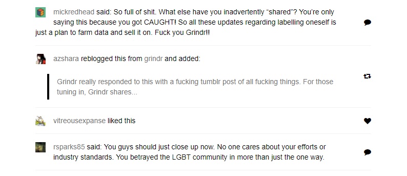 L’Electronic Frontier Foundation, no-profit in prima linea sulle questioni di privacy digitale, ha definito “deludente” la risposta di Grindr. “Voi ragazzi dovreste semplicemente chiudere”, si legge in uno dei commenti nel forum online sotto il post di Tumblr di Grindr. “A nessuno importa dei tuoi sforzi o degli standard del settore. Hai tradito la comunità LGBT in più di un solo modo “.