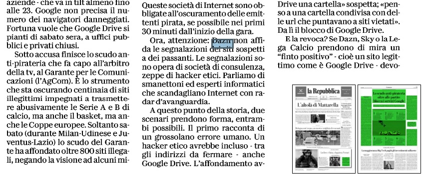 Come s’è visto, nella catena di comando i broadcaster non hanno colpa: devono agire appena fioccano le segnalazioni. Allora lo sbaglio è tutto, con ogni probabilità, localizzato tra i segnalatori, ovvero nei team di super esperti messi in piedi dalla Serie A o dalle emittenti degli eventi sportivi (Sky e Dazn). In attesa che l’Agcom, che ha in mano le segnalazioni, comunichi da chi sia partita la segnalazione che ha comportato lo switch off, Repubblica stamani riporta che il ticket sarebbe stato aperto da Dazn.