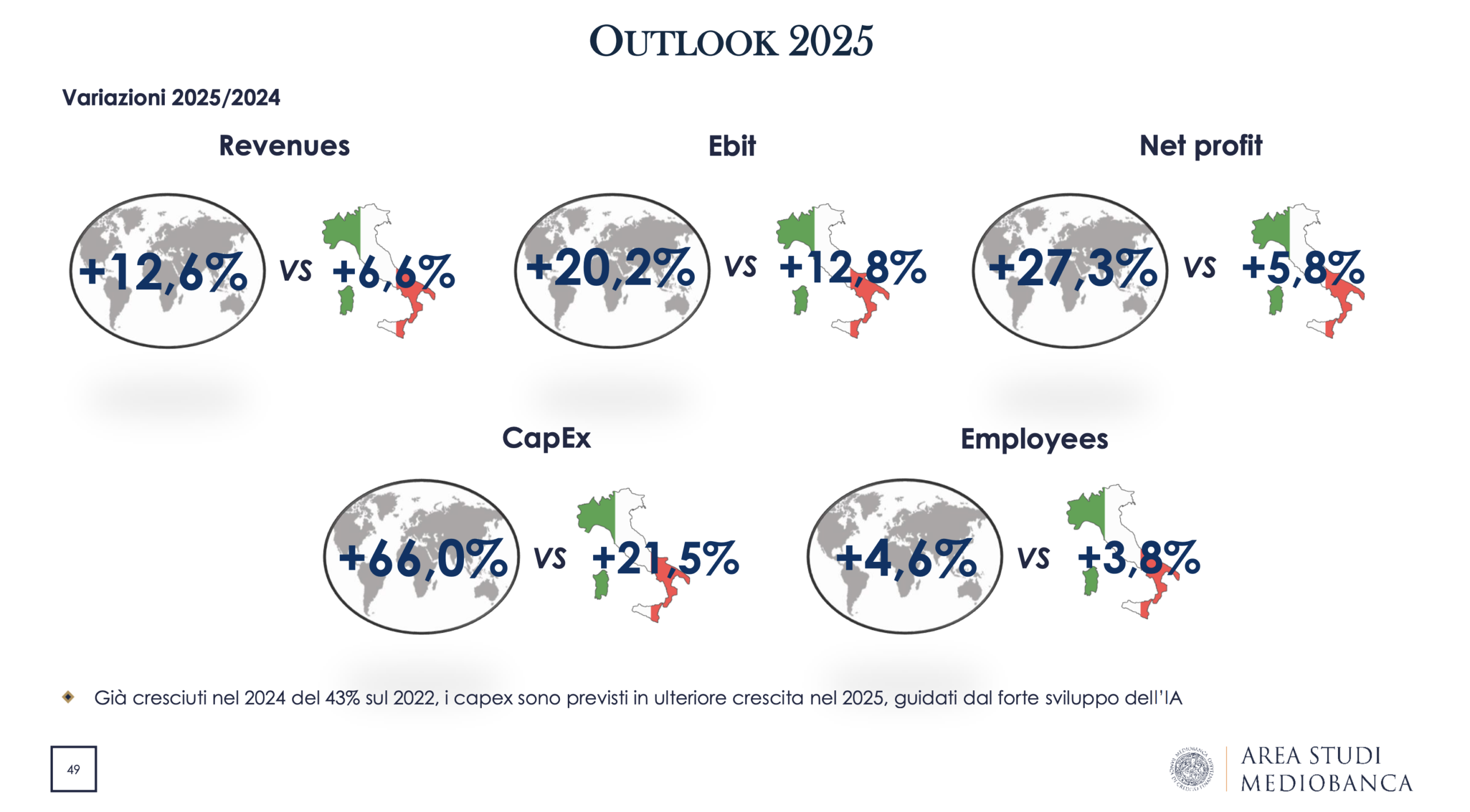La crescita non riguarda solo i ricavi: sul fronte della redditività, il margine operativo netto (EBIT) è atteso in aumento del +20,2%, mentre gli utili netti sono previsti in accelerazione del +27,3%, raggiungendo livelli record. A questi risultati si affianca l’incremento della forza lavoro (+4,6%) e, soprattutto, quello degli investimenti (+66,0%), segnali di una strategia orientata all’espansione e all’innovazione, sostenuta dall’adozione e dallo sviluppo di soluzioni basate sull’IA.