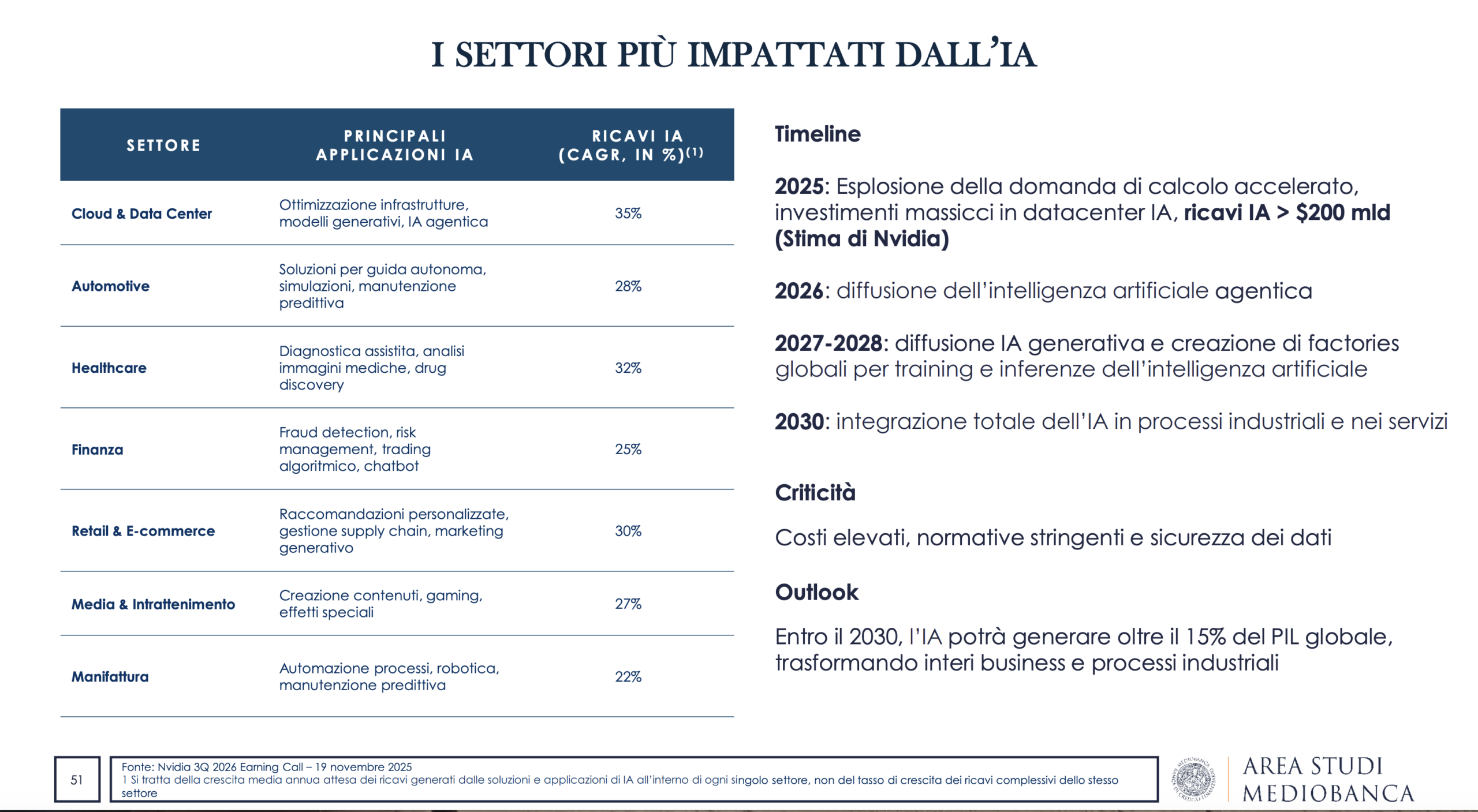 Come ricostruisce Mediobanca, negli ultimi anni il mondo tecnologico è attraversato da una trasformazione epocale guidata da tre grandi transizioni: 1) passaggio dal calcolo tradizionale basato su CPU al calcolo accelerato con GPU 2) evoluzione di modelli classici basati sul machine learning a quelli basati sull’IA generativa 3) avvento dell’«Agentic AI» e della «Physical AI» (sistemi capaci di ragionare, pianificare e interagire con il mondo fisico).