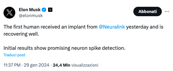 Su X, ieri Musk ha annunciato che un impianto cerebrale di Neuralink è stato installato per la prima volta in un uomo, che “si sta riprendendo bene”. Il miliardario ha poi aggiunto che “i risultati iniziali mostrano un promettente rilevamento di picchi di neuroni”.