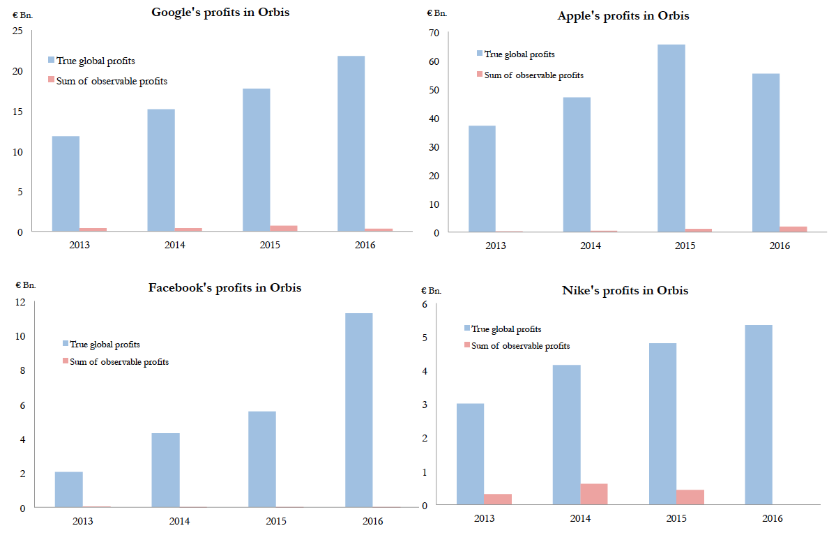 Nota: la differenza tra i profitti reali e quelli osservabili si spiega con il fatto che molte filiali estere nelle quali le aziende spostano la gran parte dei loro profitti non sono presenti in Orbis.