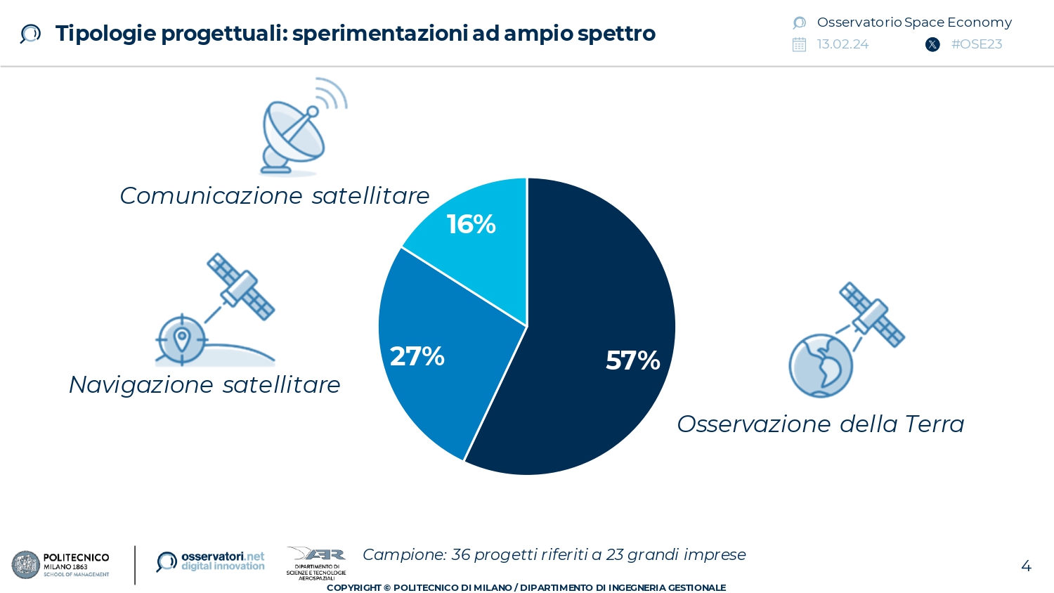 Secondo l’Osservatorio del Politecnico di Milano, l’espansione della Space Economy verso settori non spazio è appena all’inizio. Oggi solo il 10% delle grandi aziende italiane end-user si sta interessando o ha avviato iniziative legate alla Space Economy, il restante 90% non conosce il tema o non lo percepisce il valore.