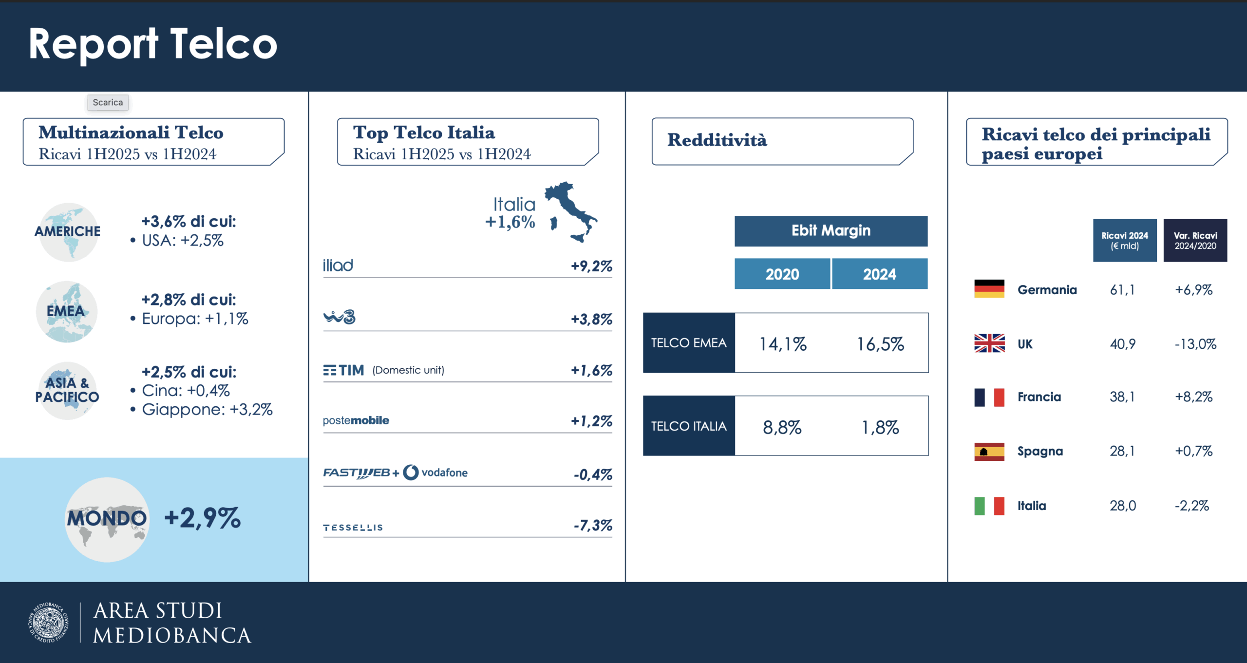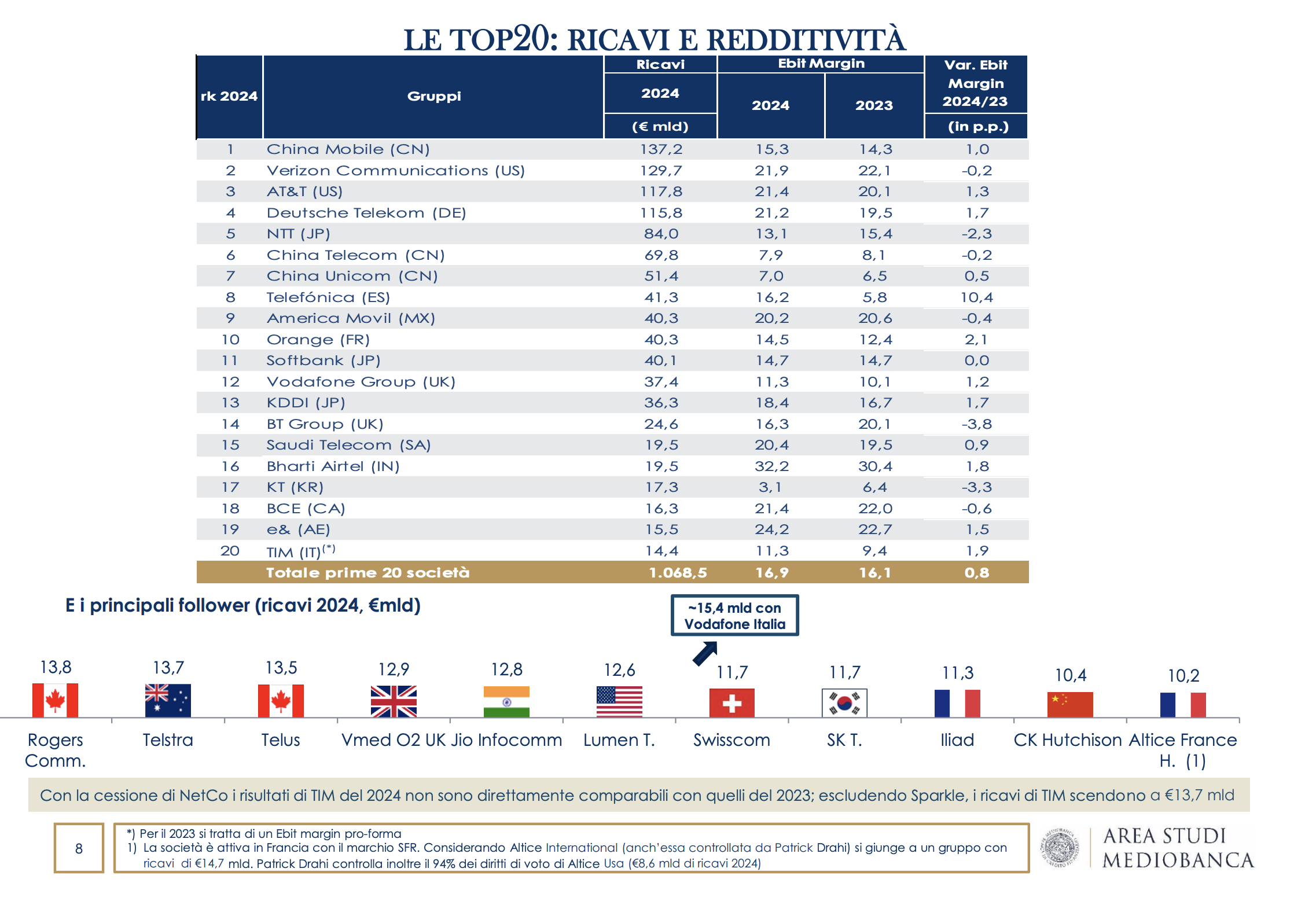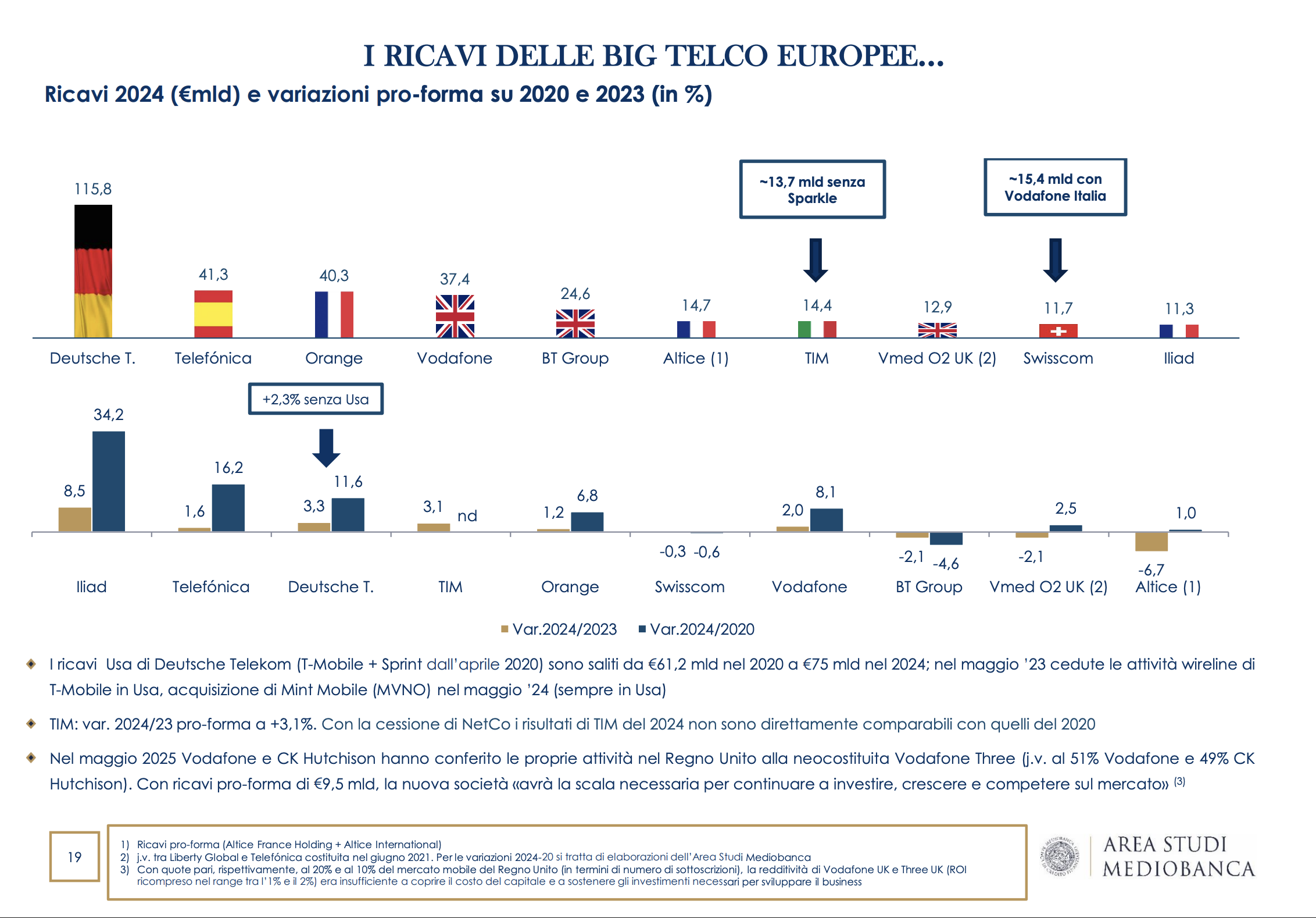 Nel primo semestre 2025, la classifica europea per ricavi è guidata da Deutsche Telekom, che raggiunge 58,4 miliardi di euro (+3,7% sul 2024). Seguono Orange con 19,9 miliardi (+0,1%, al netto delle attività spagnole confluite in Masorange) e Vodafone, che totalizza 18,7 miliardi (+1,7%, escludendo Spagna e Italia). Più indietro Telefónica con 18 miliardi (–3,3%), BT Group con 11,4 miliardi (–2%), Swisscom a 7,9 miliardi (dopo l’integrazione di Vodafone Italia, –2,3%), Altice con 6,9 miliardi (–5,3% su base pro forma) e TIM, che chiude a 6,6 miliardi, in crescita del 2,7%.