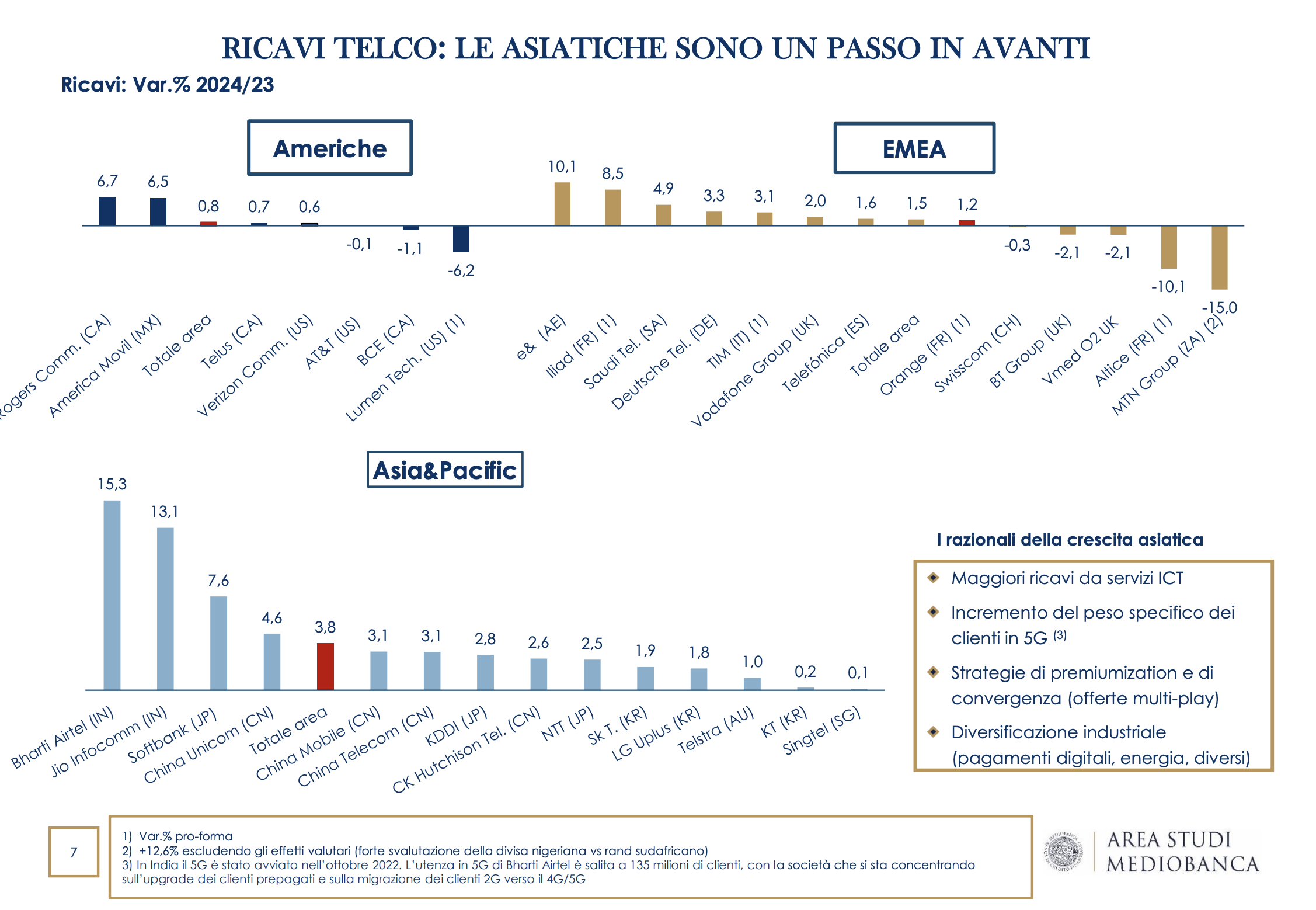 Nel 2024, il giro d’affari aggregato dei maggiori operatori mondiali è cresciuto del 2,2% sul 2023, con i ricavi da servizi in progressione dell’1,4% e il wholesale dell’1,8%, mentre le vendite di dispositivi sono aumentate dello 0,9%. Più dinamici sono risultati i ricavi da ICT (+5,4%), a conferma della centralità dei servizi innovativi per la crescita del settore, con particolare riferimento alle soluzioni su misura per grandi imprese, governi, carrier e PMI. Le telco asiatiche continuano a distinguersi, chiudendo i 12 mesi del 2024 in rialzo del +3,8%, rispetto al +1,5% dell’EMEA e al +0,8% segnato dalle telco americane.