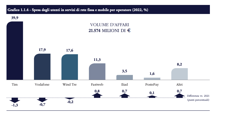 Pertanto, alla luce di quanto illustrato, per l’Agcom si delinea uno scenario competitivo in evoluzione (Grafico 1.1.4), nel quale è possibile apprezzare una diminuzione della quota di mercato di TIM (39,9%, in calo di 1,3 punti percentuali rispetto al 2021) e delle quote di Vodafone e Wind Tre (rispettivamente di 0,7 e 0,2 punti percentuali). Crescono invece Fastweb che, grazie alla progressiva integrazione dei servizi fissi e mobili, sale all’11,3% (+0,8 punti percentuali), Iliad, che ha fatto il suo ingresso anche nella rete fissa con offerte ultrabroadband con 9,5 milioni di utenti mobili a fine 2022 e una quota di mercato pari al 3,5% (+0,7 punti percentuali), e Postepay (1,6% del mercato nel 2022).
