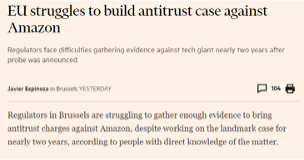 A Bruxelles è attualmente in corso un duro lavoro per cercare di trovare evidenze che possano essere sufficienti a erogare sanzioni ad Amazon, giustificate da violazioni delle norme antitrust. Nonostante l’indagine sia ormai stata avviata da circa due anni però, il lavoro non pare procedere a gonfie vele, secondo le affermazioni di persone direttamente coinvolte con l’indagine stessa.