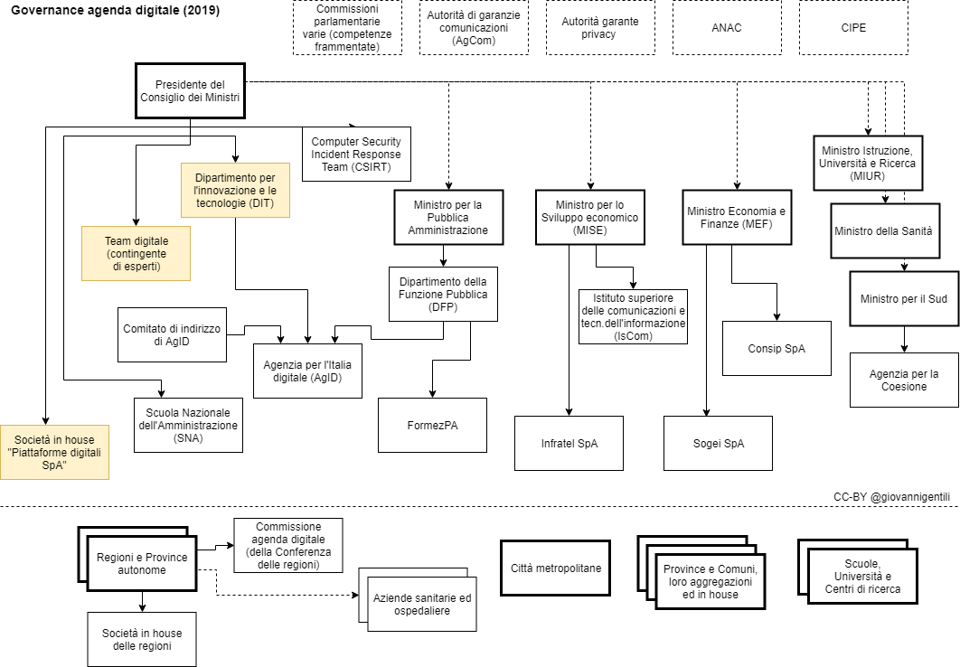 Se siete ancora qui, a questo punto abbiamo tre nuovi player del digitale alla PdCM, senza che il legislatore abbia definito una gerarchia tra di essi: Nuovo “Dipartimento per l’innovazione e le tecnologie” (DIT), Team (digitale) di esperti, Nuova società in house “Piattaforme digitali SpA”.