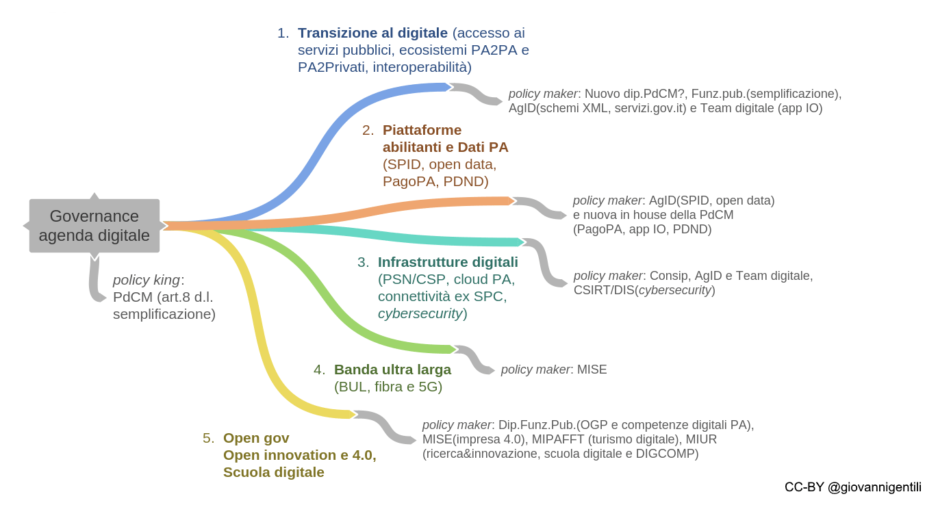 Inoltre, tutti gli altri player dell’agenda digitale nazionale restano nel pieno delle loro funzioni precedenti (a parte lo spostamento di PagoPA): AgID, Comitato di indirizzo di AgID, Dipartimento della Funzione pubblica, FormezPA, SNA, Consip SpA, Sogei SpA, MISE, Istituto superiore delle comunicazioni, Infratel SpA, MIUR, Ministero della Sanità, ecc.