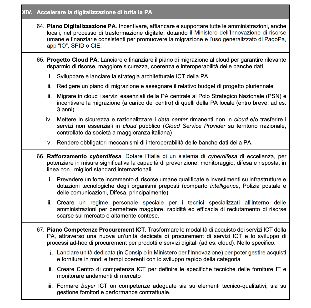 Una forte accelerazione della trasformazione digitale come strumento fondamentale per modificare radicalmente processi, comportamenti e relazioni con cittadini e imprese, agendo tramite: l’esecuzione di un piano ad hoc (gestito da un unico Ministero) per affiancare e agevolare la trasformazione di tutte le amministrazioni incluse quelle locali, il finanziamento tempestivo della migrazione al cloud per conseguire rilevante risparmio di risorse, maggiore sicurezza, coerenza e interoperabilità delle banche dati, il rafforzamento significativo della cyberdifesa tramite il forte incremento di risorse umane qualificate e investimenti su infrastrutture e dotazioni tecnologiche degli organismi preposti, lo sviluppo di processi di procurement ad hoc per prodotti e servizi ICT, che necessitano di competenze e modalità operative specifiche.