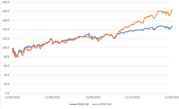 La rotazione si può notare anche nella sovraperformance delle aziende più piccole, i cui risultati risentono maggiormente degli effetti del ciclo economico, rispetto a quelle a più alta capitalizzazione.