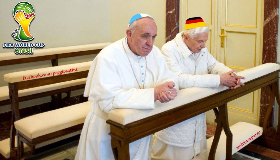 Scherza con i fanti ma lascia stare i santi, recita un famoso proverbio. I santi, appunto ma la rete non ha risparmiato né la statua del Cristo Redentore di Rio de Janeiro né i due papi, il tedesco Raztinger e l’argentino Bergoglio che domenica si troveranno a tifare l’uno contro la squadra dell’altro. Un fenomeno di costume che ha investito anche il Vaticano che in occasione della partita Argentina – Svizzera ne ha approfittato per divulgare via Twitter una vignetta in cui Papa Francesco sgrida le guardie svizzere più intente a tifare che a lavorare.