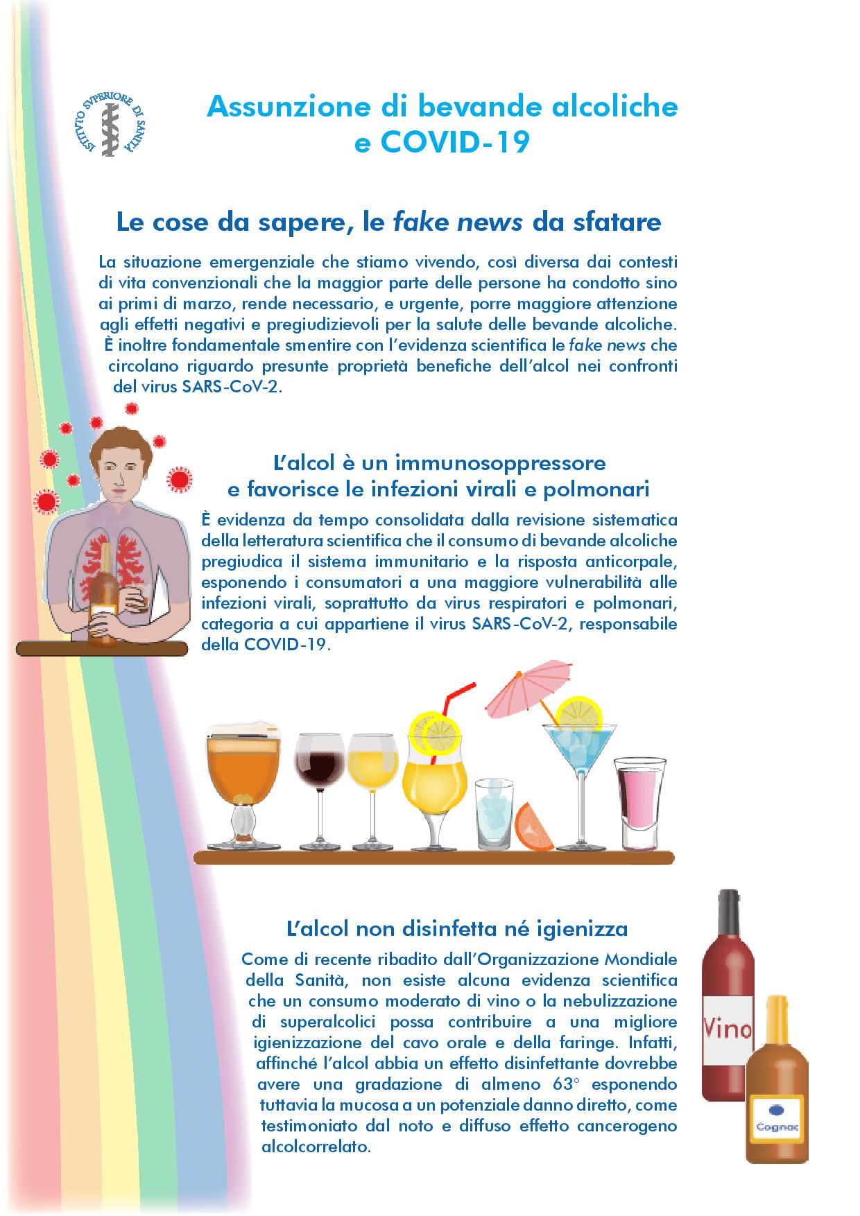 Questa nuova situazione, così diversa dai contesti di vita convenzionali che la maggior parte delle persone hanno condotto sino ai primi di marzo, rende necessario, e urgente, porre maggiore attenzione agli effetti negativi e pregiudizievoli per la salute (come il maggior rischio di infezioni e il calo delle difese immunitarie), che le bevande alcoliche determinano. È inoltre fondamentale smentire con l’evidenza scientifica le fake news che circolano riguardo inesistenti proprietà benefiche dell’alcol nei confronti del virus SARS-CoV-2 ed evidenziando gli effetti negativi che anche quantità moderate di sostanze alcoliche possono avere sull’organismo e sulla sicurezza personale e collettiva.