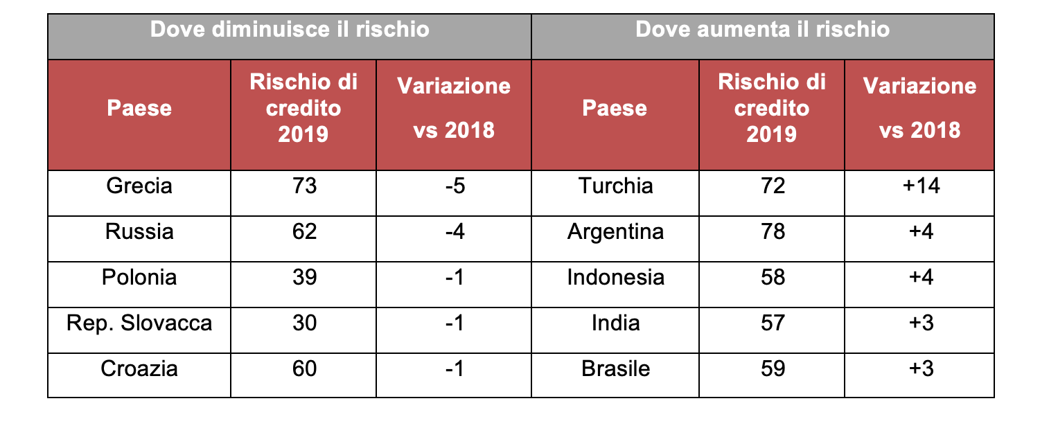 Si evidenzia infine l’aumento generalizzato del rischio di trasferimento, legato alla possibilità di restrizioni alla convertibilità della valuta nazionale in valuta forte o al trasferimento all’estero di profitti e dividendi. Nel 2018, sono stati 47 i paesi dove il rischio di trasferimento è aumentato, a fronte di 31 miglioramenti. Fra i downgrade vari paesi africani (fra cui lo Zambia), alcune geografie dell’Asia centrale (quali Turkmenistan, Azerbaigian e Kazakistan), Tunisia, Iran e Albania.