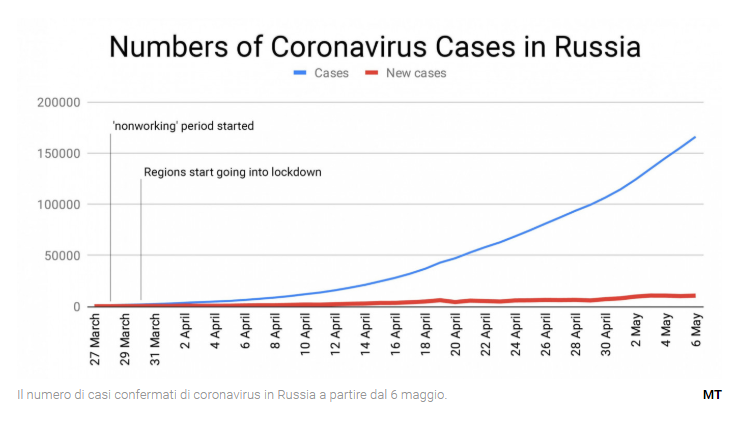 Partiamo dai numeri. In Russia sono stati registrati 10.559 nuovi contagi nelle ultime 24 ore. Ieri, per il quarto giorno consecutivo si contano oltre 10.000 nuovi casi di Covid-19 (due giorni fa erano stati annunciati 10.102 nuovi casi, tre giorni fa 10.581 e domenica 10.633). Le infezioni totali sono pari a 165.929.