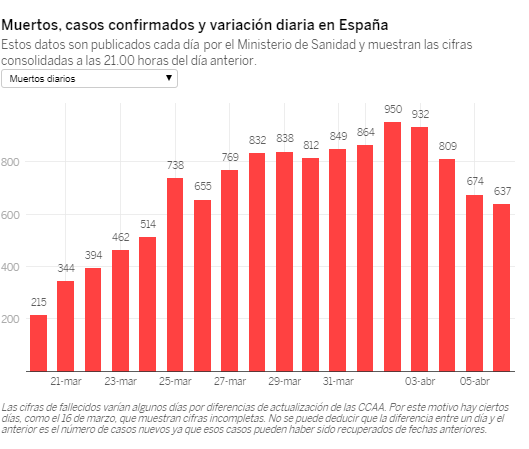 Il numero dei decessi, nelle ultime 24 ore, è stato pari a 637, portando il totale a 13.055. Il numero dei morti è in calo per il quarto giorno consecutivo e, secondo i calcoli del Ministero della Salute, riportati dal El Pais, è il numero più basso dal 24 marzo, ovvero degli ultimi 13 giorni.