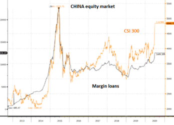 Di seguito un grafico che evidenzia come il forte recupero dei listini azionari cinesi sia stato reso possibile di fatto da una brusca ripresa dei margin loans, ossia dall’autorizzazione all’apertura di conti individuali presso broker che prestano soldi per acquisto di azioni.