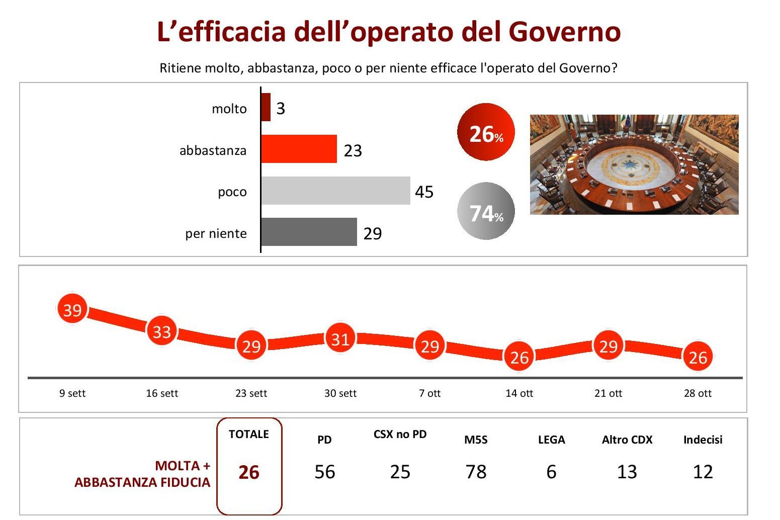 Continua a calare la fiducia nel presidente del Consiglio, Giuseppe Conte, e diminuisce pure il giudizio positivo sull’efficacia del governo M5s-Pd-Leu-Iv.