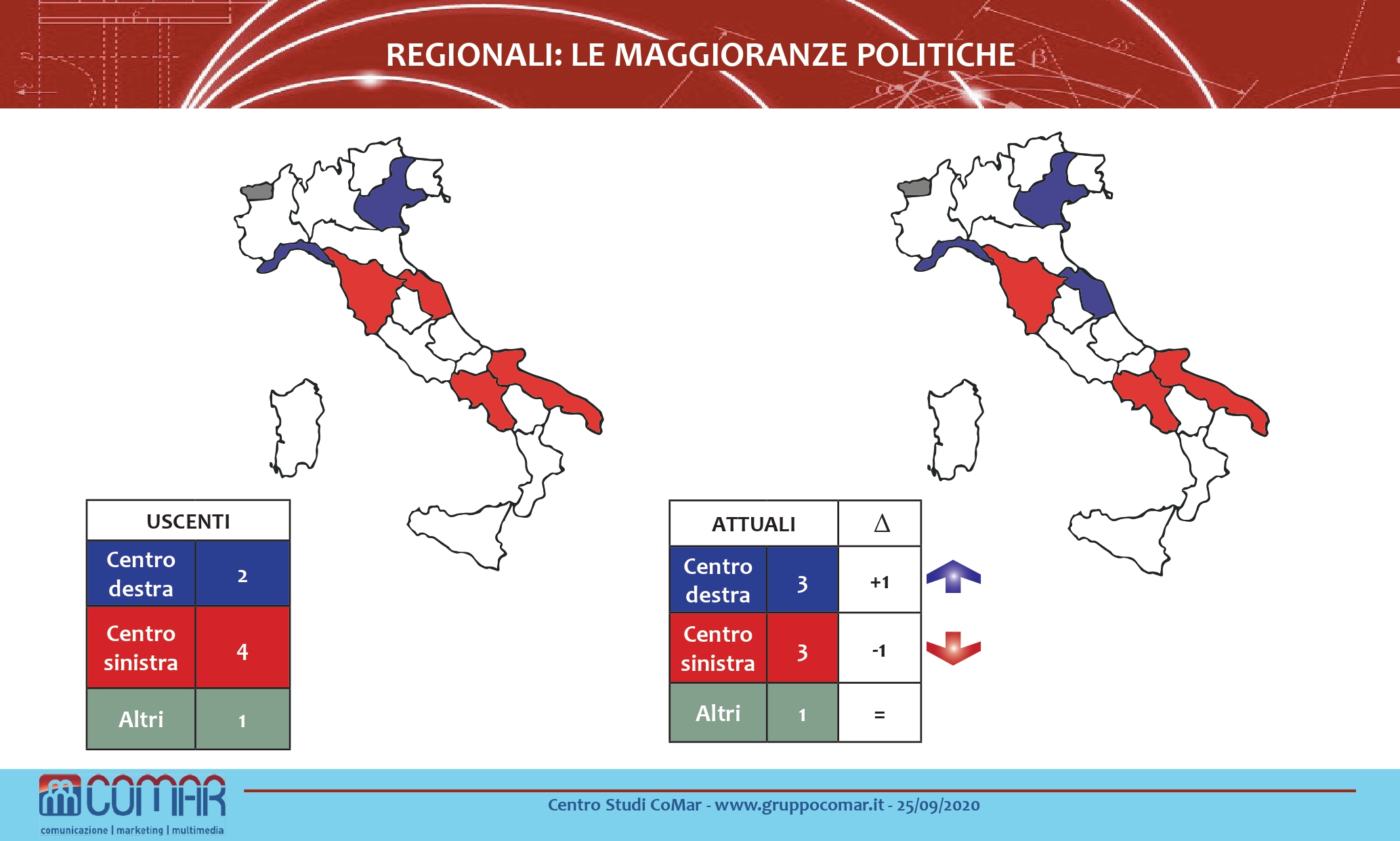 3 Regioni al Centrosinistra (le centromeridionali Toscana, Campania e Puglia; con la perdita delle Marche); 3 al Centrodestra (Veneto, Liguria; cui si aggiungono le Marche); 1 dove si prevede altra tipologia di maggioranza (Valle d’Aosta, con un sistema sostanzialmente proporzionale, che lascia ad un momento successivo l’elezione del Presidente e l’indicazione della Giunta; sulla base dei risultati, è plausibile una maggioranza politica tra Autonomie e Progressisti).