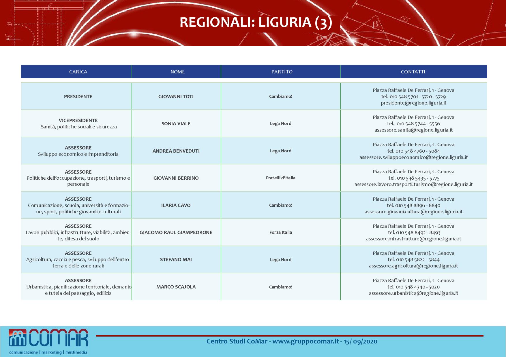 In Liguria Giovanni Toti (centrodestra) è avanti con una forbice compresa tra il 51-54% su Ferruccio Sansa (centrosinistra) che è tra il 33 e il 37%.