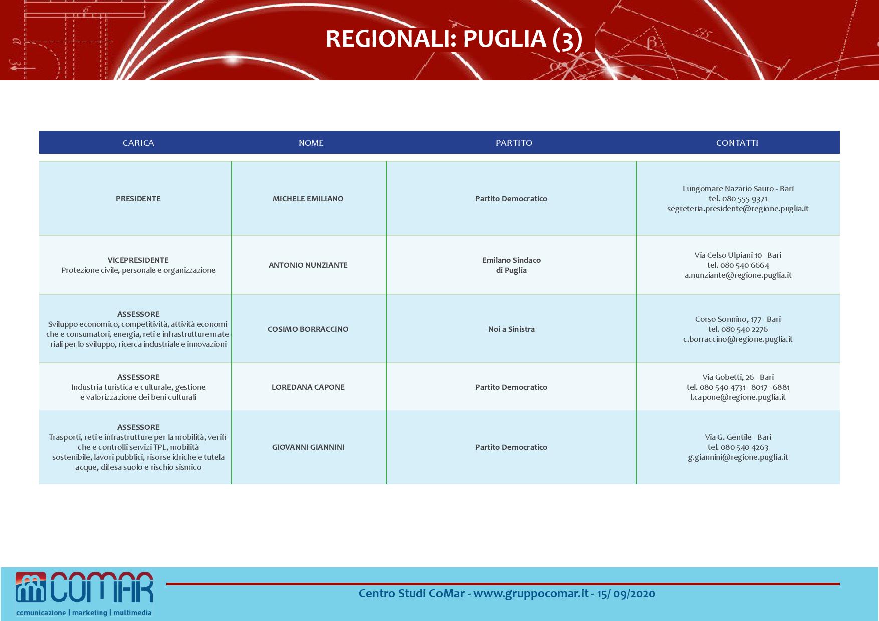 In Puglia è testa a testa tra Michele Emiliano (centrosinistra) e Raffaele Fitto (centrodestra), entrambi tra il 39 e il 43%.
