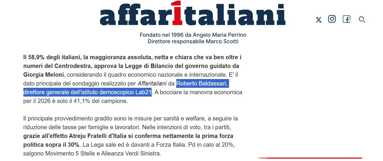 Il popolo ha parlato, che tacciano dunque le singole forze politiche. “Il Tg1 di oggi (domenica 21 dicembre) alle ore 13.30 cita il sondaggio di Affaritaliani – secondo il quale un italiano su dieci approva la Legge di Bilancio 2026 – e scoppia il caso politico. Il presidente del Consiglio commenta ad Affaritaliani (“Un dato che ci incoraggia e ci responsabilizza ancora di più”) e il Partito Democratico insorge. Poi la risposta di Forza Italia con Maurizio Gasparri”.