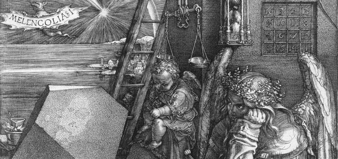 In questo senso, viene in mente una celebre opera-simbolo: “Melencolia” di Albrecht Dürer, forse l’unico artista tedesco veramente rinascimentale. Datata 1514, è un “bulino”, cioè una stampa ottenuta con una punta di acciaio capace di incidere la lastra di rame – poi inchiostrata – con un segno molto netto ed eloquente. Un’opera complessa, evidentemente pensata a lungo, che ha diverse chiavi di lettura, e che non fortuitamente coincide con l’anno di morte della madre del pittore. La figura solenne, ali semichiuse e sguardo nel vuoto, seduta su un gradino di pietra, con la testa sorretta da un braccio puntellato dal ginocchio, raffigura egregiamente l’inerzia del ripiegamento tipica del depresso. È un’immagine femminile, che allude alla prevalenza della depressione nelle donne. Anche il cane, amico fedele, giace immoto e raggomitolato in se stesso. Soltanto un piccolo genio alato appare attivo e scrive, quasi a testimoniare un briciolo di vitalità non del tutto perduto. Gli strumenti di lavoro abbandonati per terra stanno a indicarne la mancanza di significato e di uso, in questa situazione di luce spettrale, in cui la vita è come immobile e cristallizzata.