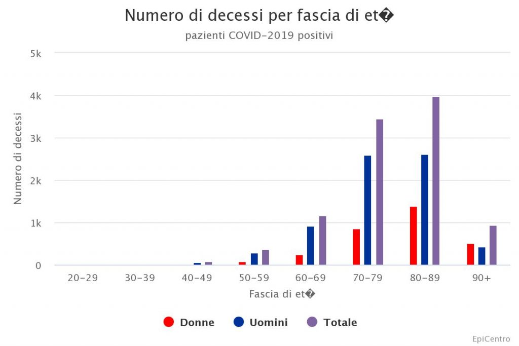 L’età media dei pazienti deceduti e positivi a COVID-19 è 78 anni (mediana 79, range 26-100, Range InterQuartile – IQR 73-85). Le donne sono 3088 (30,8%). Per 2 pazienti il dato dell’età non era disponibile. L’età mediana dei pazienti deceduti positivi a COVID-19 è più alta di oltre 15 anni rispetto a quella dei pazienti che hanno contratto l’infezione (età mediane: pazienti deceduti 79 anni – pazienti con infezione 62 anni). Il grafico mostra il numero dei decessi per fascia di età. Le donne decedute dopo aver contratto infezione da COVID-19 hanno un’età più alta rispetto agli uomini (età mediane: donne 82 – uomini 78).