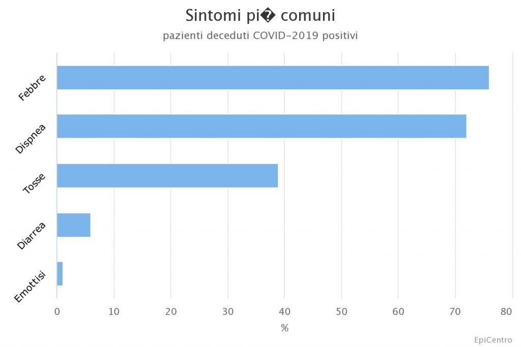 Il grafico mostra i sintomi più comunemente osservati prima del ricovero. Febbre, dispnea e tosse rappresentano i sintomi più comuni. Meno frequenti sono diarrea e emottisi. Il 6,0% delle persone non presentava alcun sintomo al momento del ricovero.