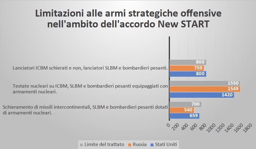 Il New START limita a 1.550 le testate nucleari che ciascuno dei due paesi può schierare e fissa anche limiti quantitativi al numero di missili balistici intercontinentali a capacità nucleare, ai bombardieri e ai lanciatori schierati. Il New START prevede un meccanismo di ispezioni (18 ispezioni a breve termine all’anno) e di notifiche reciproche, nonché incontri regolari per discutere l’attuazione del trattato.