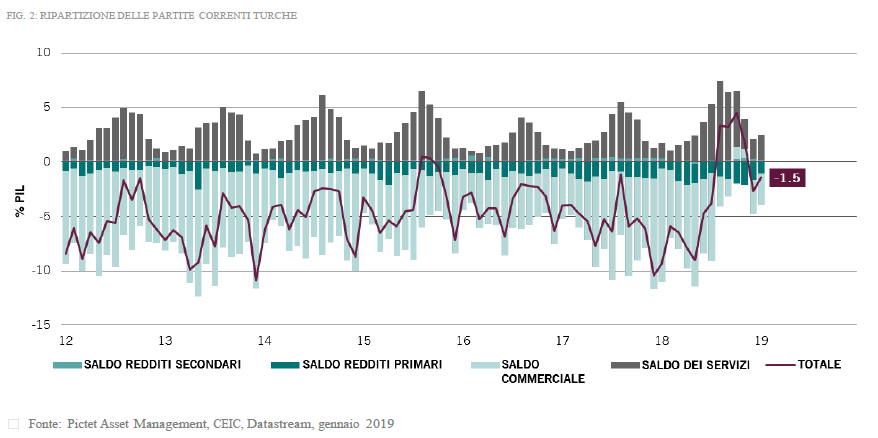 Questa fragilità è espressa dalla volatilità delle partite correnti turche, che come sotto indicato, sono tornate in deficit. Un ulteriore notevole deprezzamento della lira turca rischia di generare un circolo vizioso, destinato ad accentuare la portata della recessione economica.