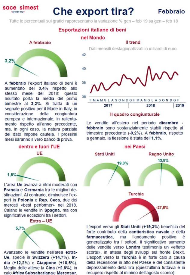 A febbraio l’export italiano di beni è aumentato del 3,4% rispetto allo stesso mese del 2018: questo risultato porta la media del primo bimestre al 3,2%.