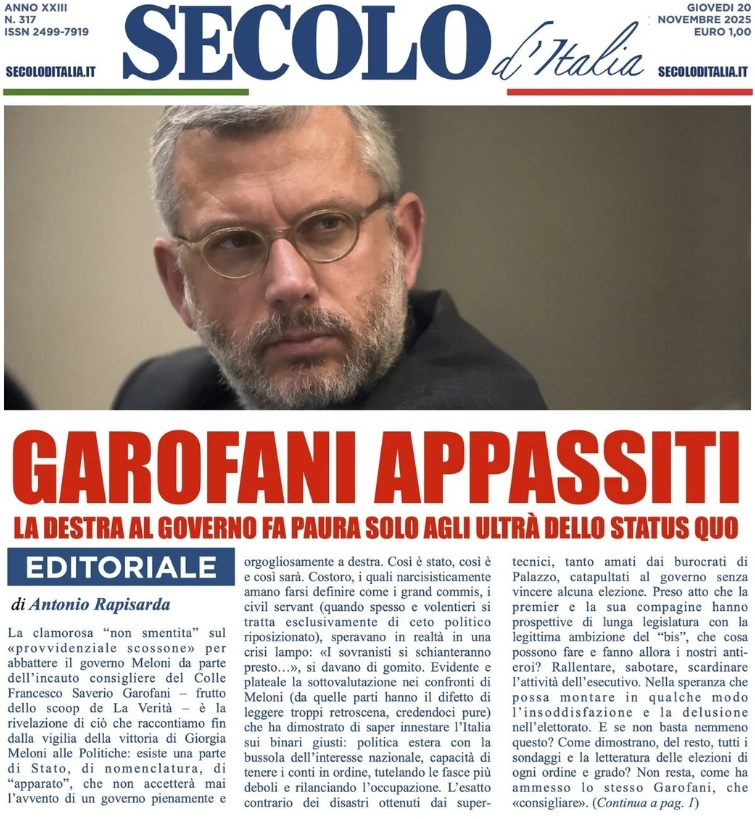 Insomma, direttore, questi i fatti. Come vedi mi sono attenuto a dichiarazioni concrete e verificabili, non a presunti retroscena come fanno tanti quotidiani. Se tanto mi da tanto, giudicato il cursus honorum di chi firma quell’intervento e la sua vicinanza storica all’attuale direttore editoriale del quotidiano (Bocchino), non c’è solo Galeazzo Bignami a rumoreggiare. Peraltro, ripescando la prima pagina del Secolo d’Italia di ieri, 20 novembre, così da fornire una rassegna stampa davvero completa, pure il direttore responsabile Antonio Rapisarda (già cronista a Libero e poi firma del quotidiano Il Tempo) non è certo per la pacificazione immediata col Colle senza che paghi l’obolo di costringere Garofani alle dimissioni.
