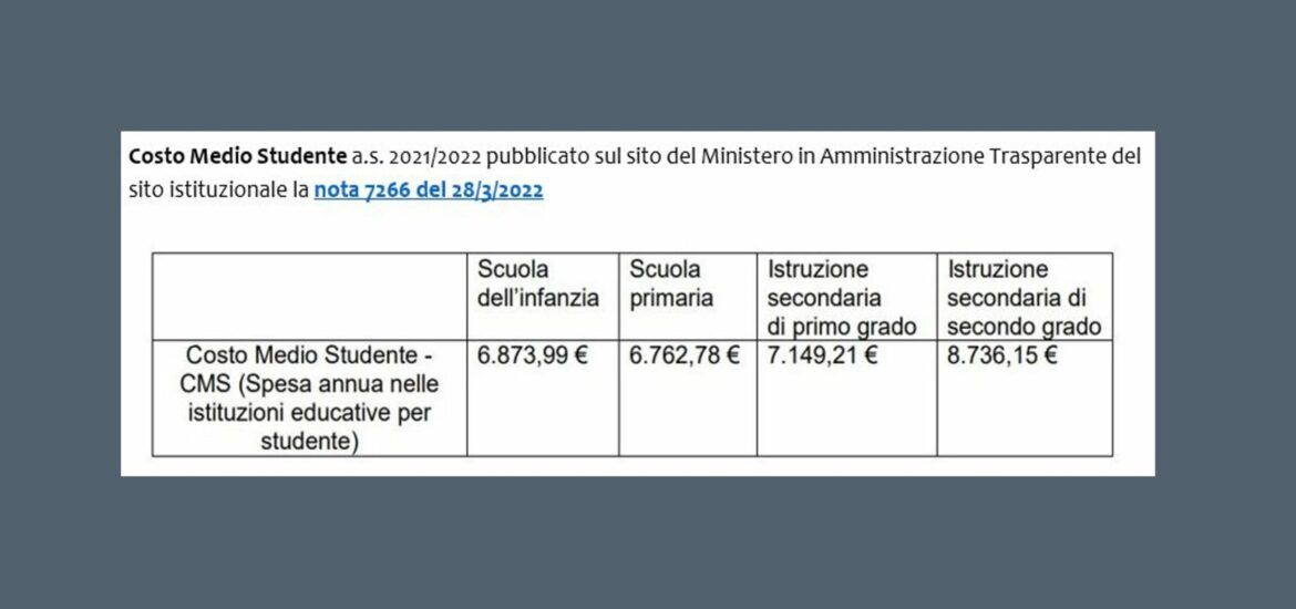 Ogni anno il Ministero dell’Istruzione stabilisce, con circolare dedicata, il Costo Medio dello Studente italiano, a seconda dei Cicli. È un dato fondamentale per comprendere tante dinamiche del mondo della scuola, dallo spreco dei danari dei contribuenti per coprire i buchi della scuola pubblica statale, al motivo per il quale le scuole pubbliche paritarie sono destinate a chiudere i battenti.
