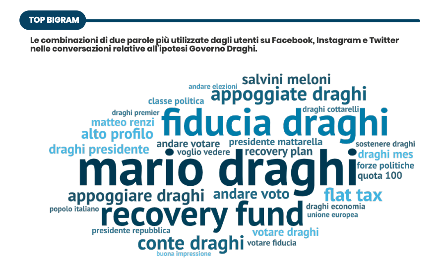 Anche nella top bigram, ovvero le combinazioni di due parole più utilizzate dagli utenti su Facebook, Instagram e Twitter, nelle conversazioni relative all’ipotesi governo Draghi le parole accostate sono “fiducia draghi”, “appoggiate draghi” “appoggiare draghi”.