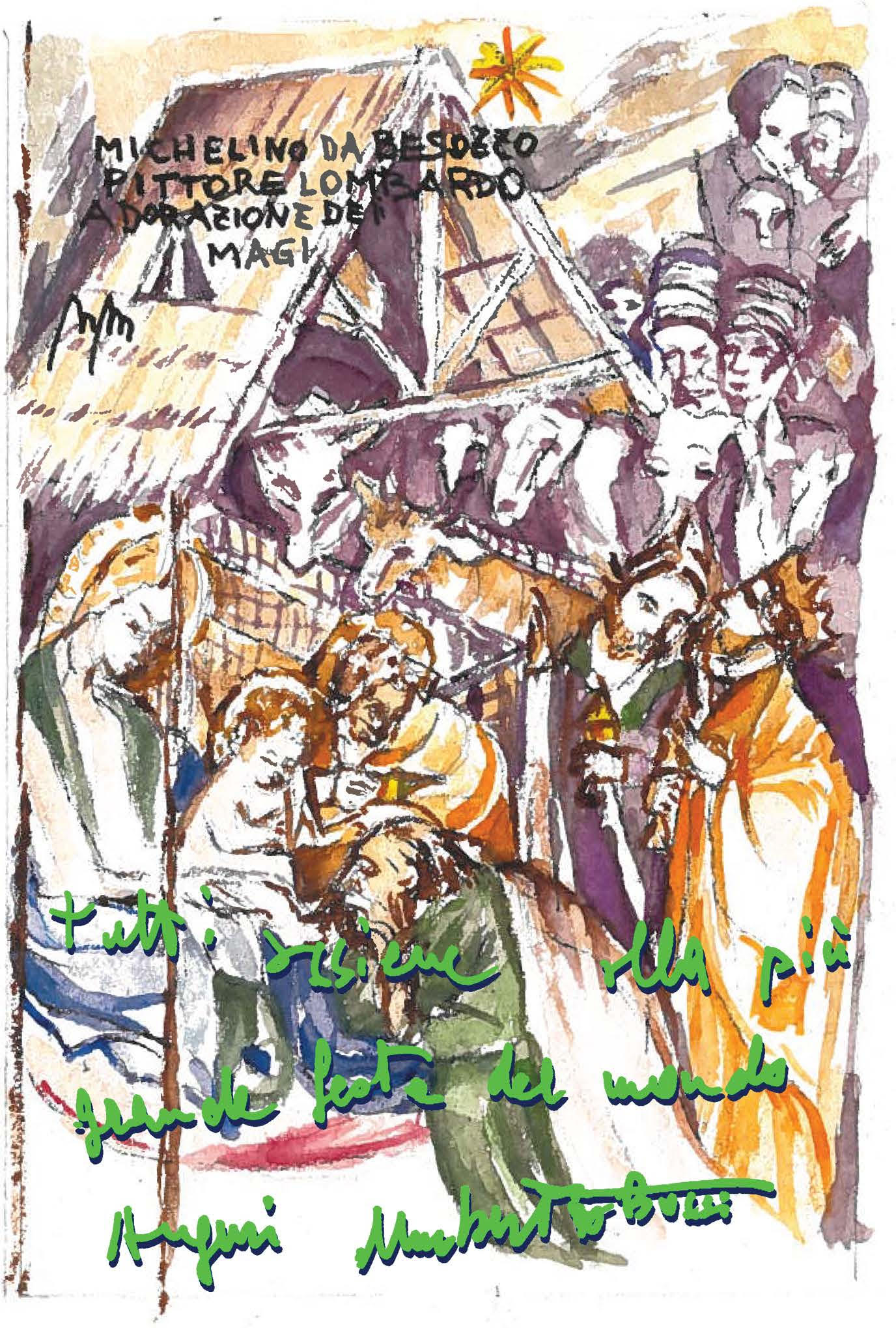 Il cartoncino di auguri più toccante fu durante il Covid, quando fece dipingere “Na Mameta”, ovvero in dialetto lombardo “Una nonnetta”, che fugge da una casa per anziani per andare su una collina dalla quale cerca con nostalgia il luogo dove aveva vissuto con la sua famiglia. Il biglietto dell’anno scorso raffigura la chiesa di S. Eustorgio che raccoglie le reliquie dei Magi. E sempre a loro è dedicato il cartoncino di quest’anno. Trentesima edizione degli auguri bossiani. Storia della Lega Nord, storia del nostro Paese attraverso la vena artistica del gran capo “padano”.