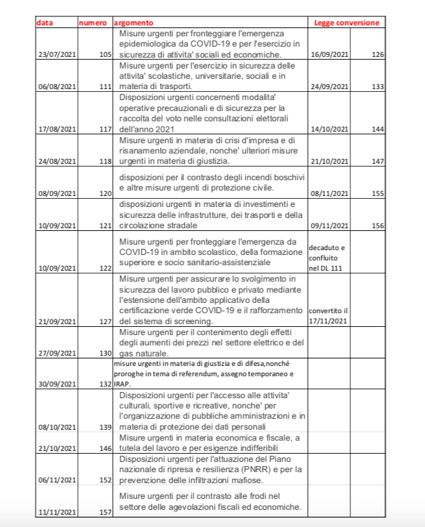 Da allora sulle Camere si è scatenato un vero e proprio diluvio normativo. Proprio in quello stesso giorno arrivò il decreto legge 105 che aprì la lunga sequenza di decreti relativi alla disciplina del green pass. L’ultimo è arrivato giovedì 11, raggiungendo così quattordici decreti legge, di cui sette convertiti, uno decaduto e sei in attesa di conversione. Quasi uno alla settimana, agosto compreso. Ad essi si aggiungono i disegni di legge delega sulla riforma fiscale, sulla riforma del processo civile (approvato al Senato e in discussione alla Camera), sulla riforma della disabilità e sulla concorrenza (ancora in transito tra Ragioneria e Quirinale). Oltre alla riforma del processo penale che è già legge dal 27 settembre. Il tutto in piena sessione di esame della legge di bilancio 2022, presentata al Senato solo il 16 novembre, con notevole ritardo rispetto al previsto termine del 20 ottobre.