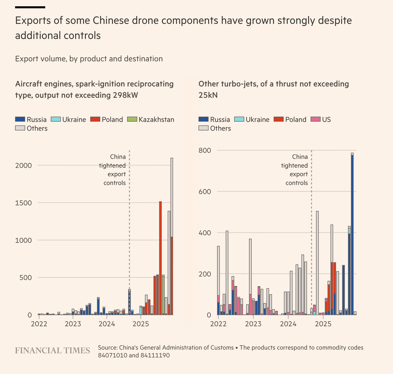 Eppure, come evidenzia ancora il Ft, parti cinesi compaiono ancora nei droni russi abbattuti. Un’analisi del Centre for Defence Reforms, un think tank di Kiev, ha mostrato che i componenti cinesi hanno superato di poco quelli statunitensi nel 2025, con i componenti svizzeri al terzo posto.