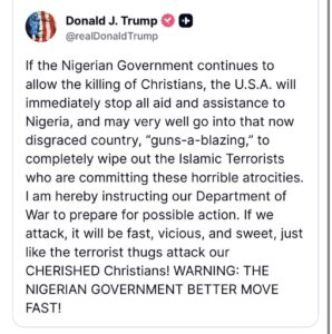 Negli ultimi anni, la Nigeria é stata teatro di un’intensa attività da parte di gruppi affiliati all’Isis, con ripetuti attacchi a villaggi e comunità religiose cristiane, compiendo atroci massacri che hanno reso la regione un obiettivo strategico della politica antiterrorismo dell’Amministrazione Trump.