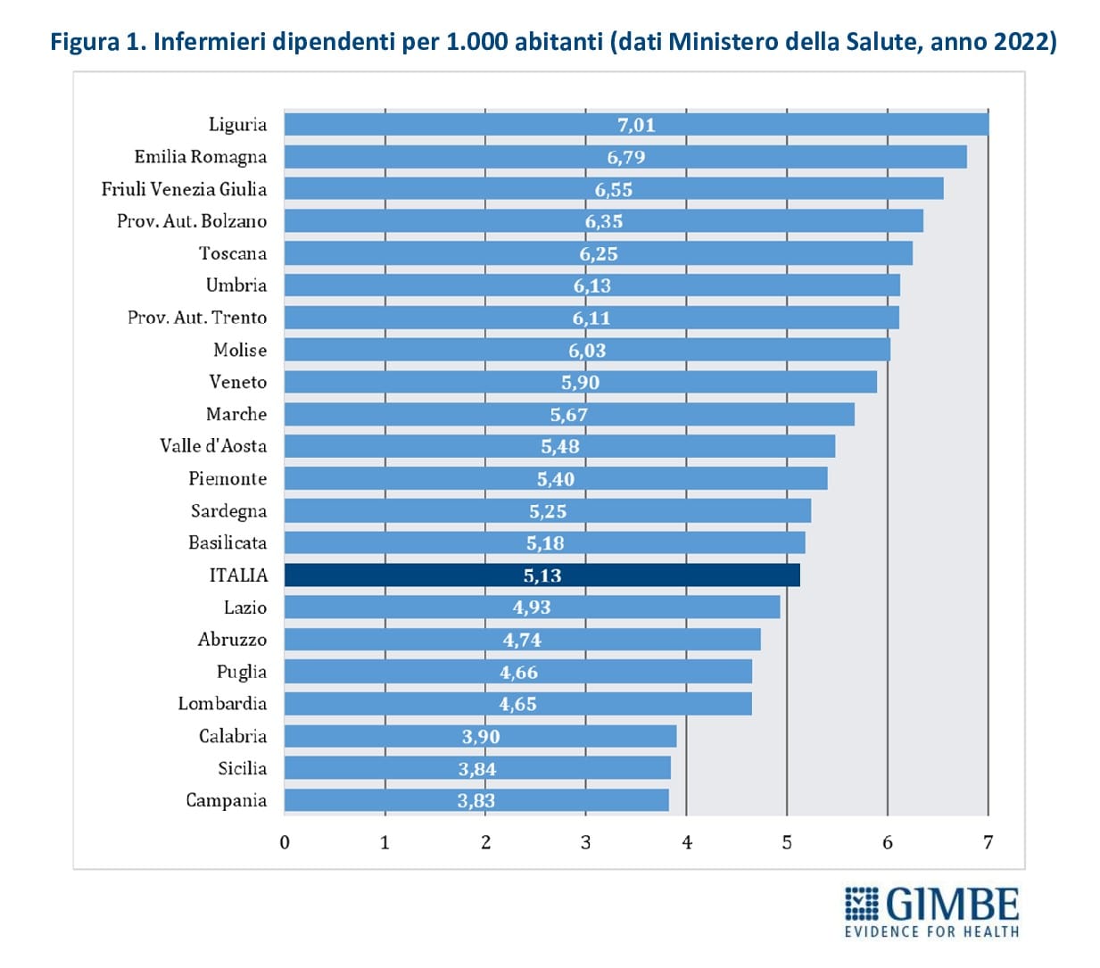 In Italia ci sono 5,13 infermieri ogni 1.000 abitanti, con forti disomogeneità territoriali: dai 3,83 della Campania ai 7,01 della Liguria. “In generale – commenta il presidente di Gimbe, Nino Cartabellotta – il numero di infermieri risulta più basso in quasi tutte le Regioni del Mezzogiorno, sottoposte ai Piani di rientro, oltre che in Lombardia”.