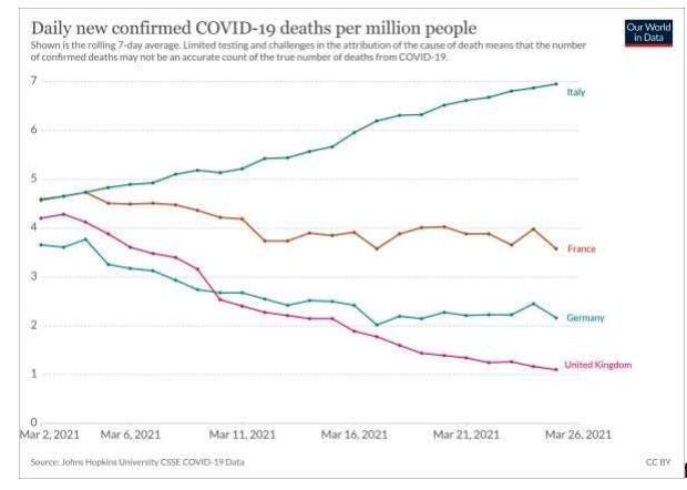 Al 5 aprile 2021, in Italia, sono stati somministrati oltre 11 milioni di vaccini, ma solo il 47,38% è stato inoculato agli over 70 (fonte Ministero della Salute). Dalla fig. 3: andamento del numero di morti Covid-19 per milione di abitanti della popolazione residente in Italia, Francia, Germania e Regno Unito.