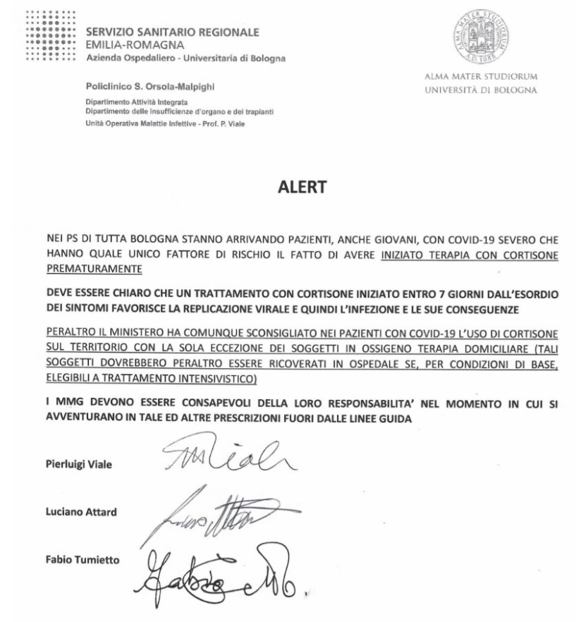Una terapia con cortisone prescritta “entro sette giorni dall’esordio dei sintomi”, scrivono dal Sant’Orsola, “favorisce la replicazione virale e quindi l’infezione e le sue conseguenze”.